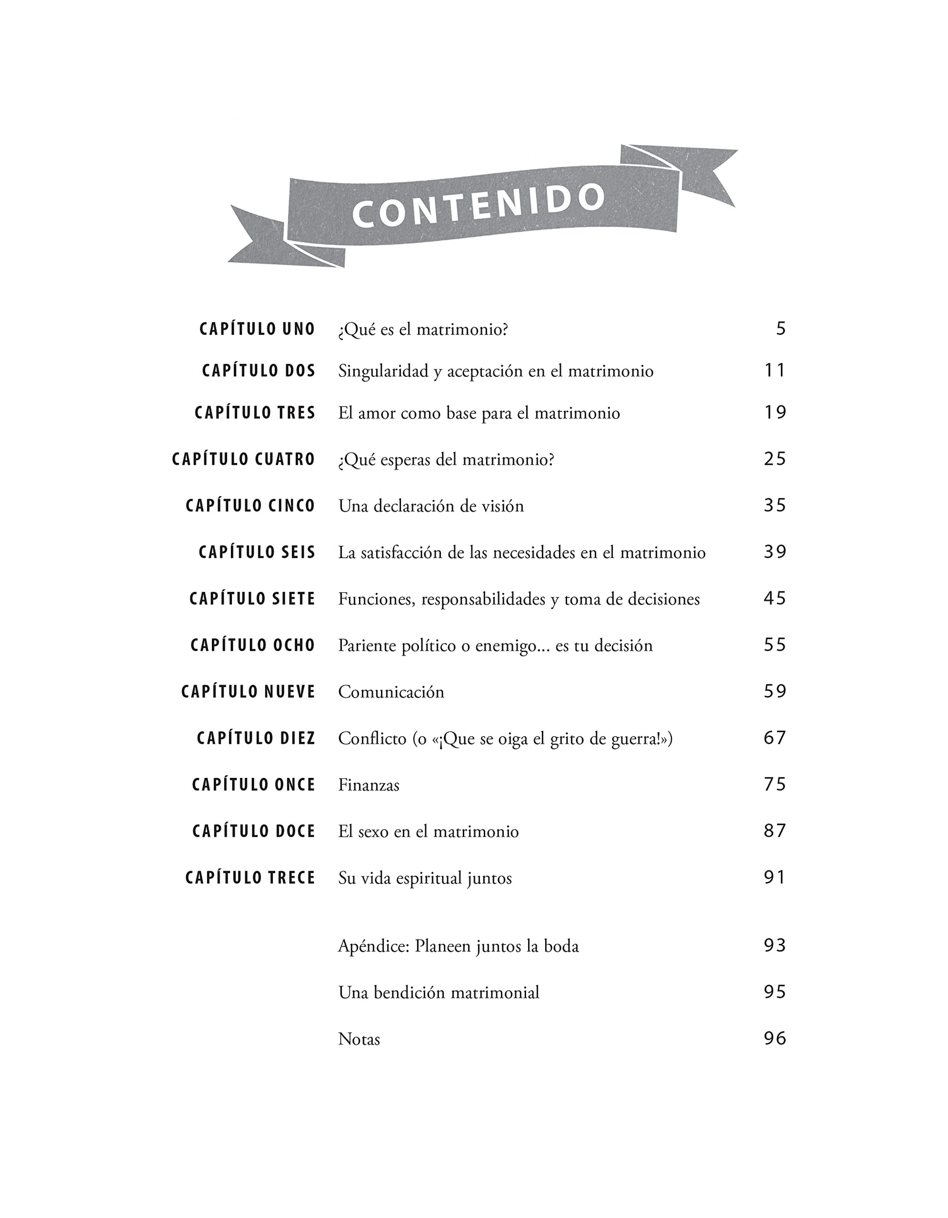Esta guía cristiana interactiva les guiará en la exploración profunda de su relación y les ayudará a: Desarrollar una nueva visión de su pareja y de cómo ambos se relacionan entre sí. Establecer sus deseos y necesidades como individuos y como pareja antes de comenzar su matrimonio. Sentar las bases de una conversación bíblica y honesta para un matrimonio más unido y saludable. Revelar cómo los acontecimientos de la vida y los antecedentes familiares pueden influir en la toma de decisiones en las finanzas, la familia, la educación, la fe y la carrera. Involucrarse en actividades que lleven a una discusión reflexiva sobre sus experiencias pasadas y sus expectativas actuales.