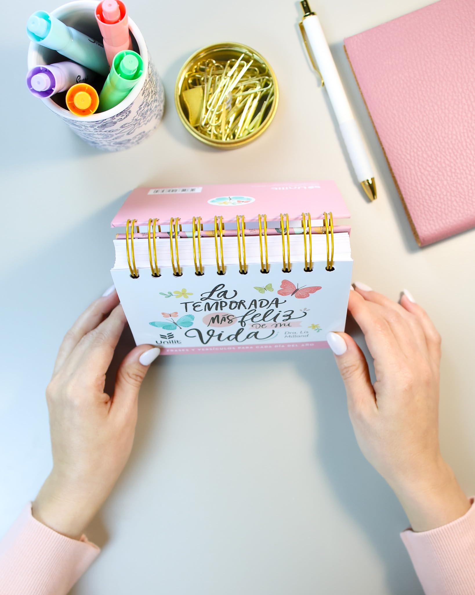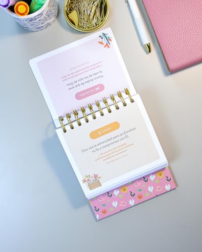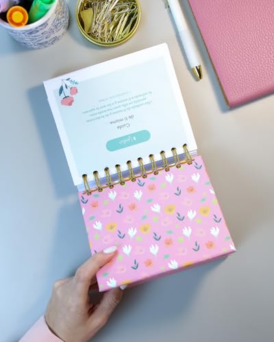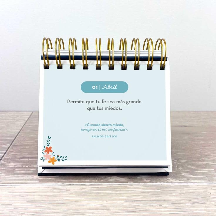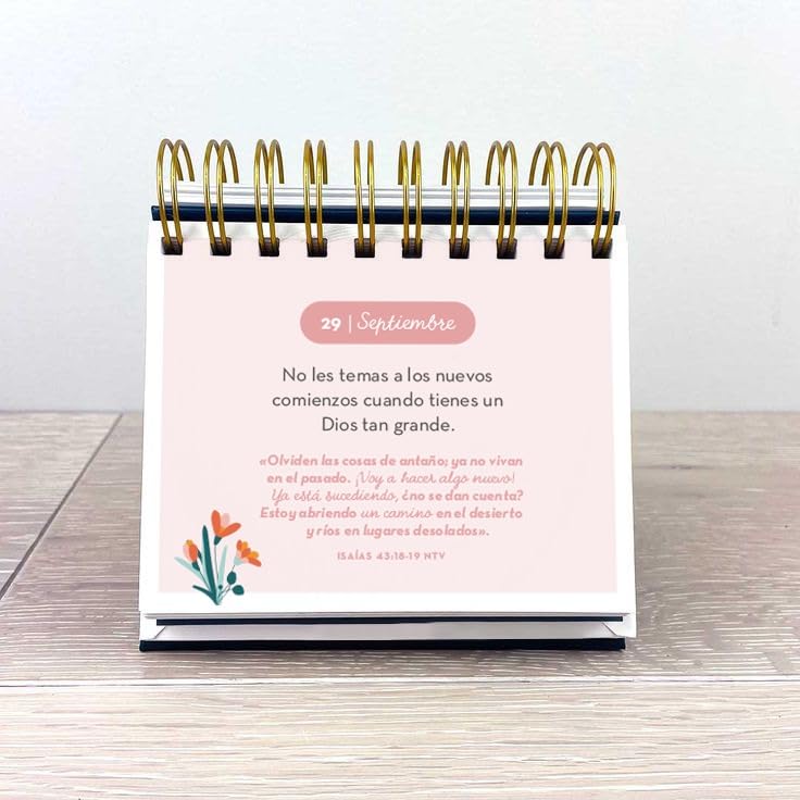 Versículos bíblicos para cada día del año Impreso a ambos lados, a todo color Cubierta acolchada en tapa dura y la encuadernación en espiral. Soporte integrado que lo mantiene firme sobre cualquier superficie. No hay años impresos en las páginas, por lo que el calendario es perpetuo. Se puede comenzar a utilizar en cualquier momento del año.