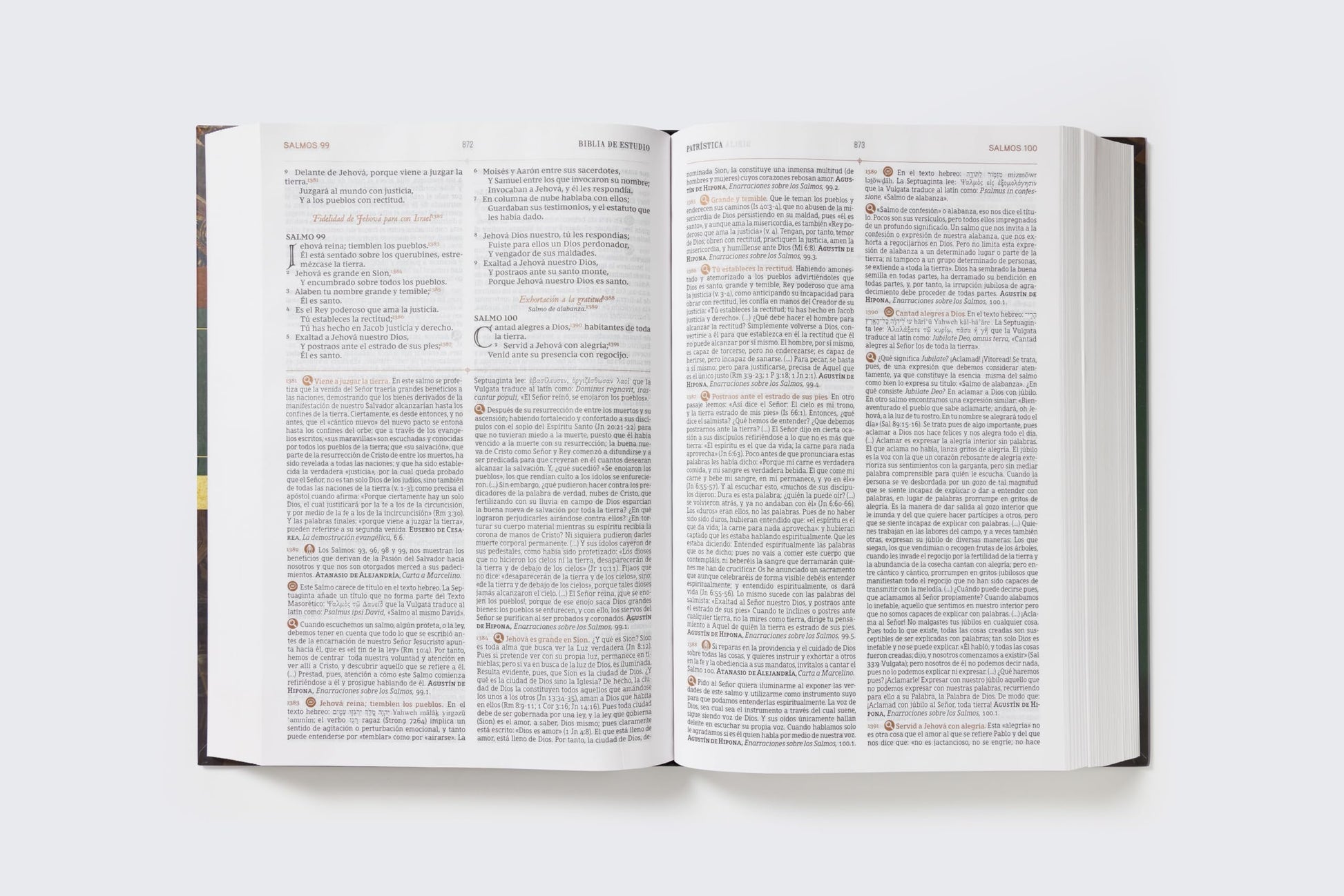 The Bible includes the words of Christ in red, tables, graphs, and chronologies that help visualize the understanding of the text, along with a series of 50 resources or studies on Bible passages.
