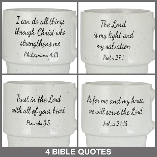 - Juego inspirador: cuenta con cuatro tazas de gres de 15 onzas adornadas con versos bíblicos edificantes de Proverbios, Filipenses, Josué y Salmos