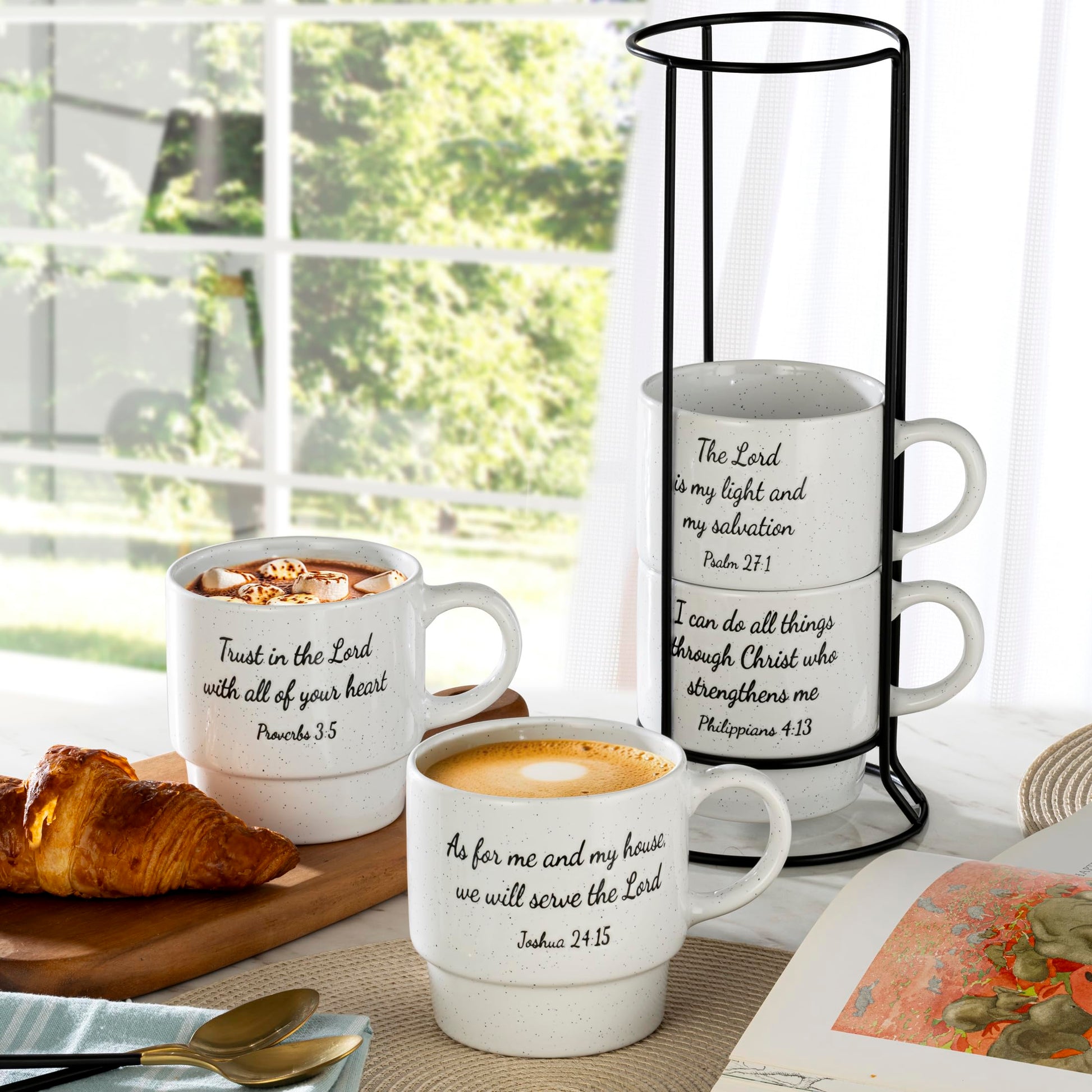 ▶ Juego de 4 tazas de café apilables con estante de alambre de metal, tazas de café de 15 onzas para café, té, cacao, leche, capuchino, chocolate caliente, versículos bíblicos