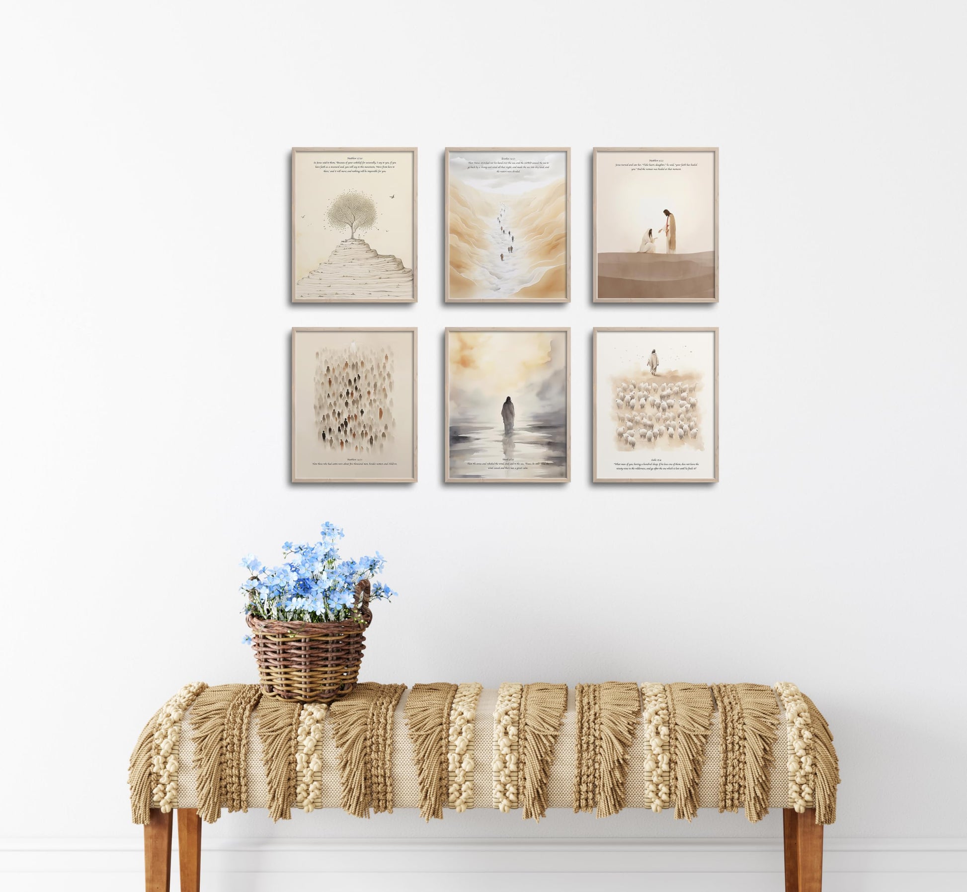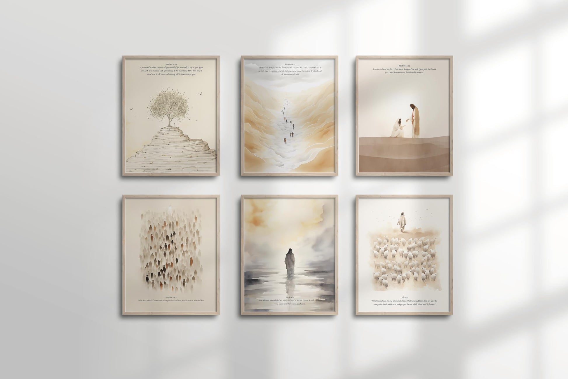 - Decoración minimalista de la habitación de historia bíblica bohemia: parábola de la semilla de mostaza | Moisés partiendo el mar rojo | Jesús sana a la mujer sangrante | Jesús alimenta al 5000 | Jesús calma la tormenta | Jesús deja el 99