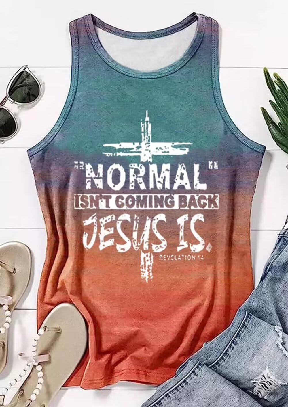 - Características: Normal Isn't Coming Back Jesus Is Revelation 14 playera sin mangas, Faith Jesus Cross Tank, playera cristiana de religión retro, playera con gráfico clásico, playera con versículo bíblico, playera divertida sin mangas, regalo cristiano novedoso, playera casual de verano con cuello redondo para mujer.